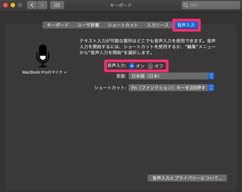 fnキーを2回タイプしても音声入力が立ち上がらない場合は、Macの「設定」から「キーボード」→「音声入力」の順に進み「音声入力」をオンにしてください。