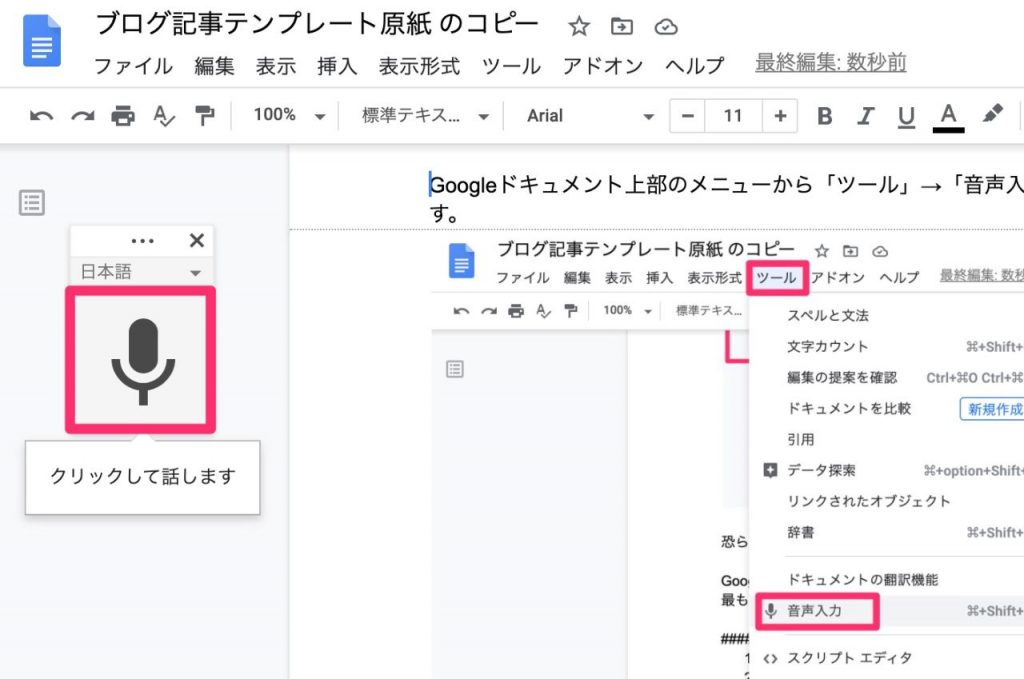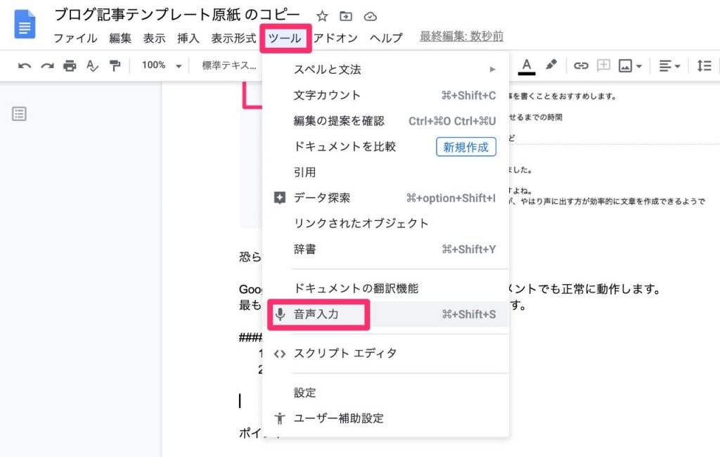 Googleドキュメント上部のメニューから「ツール」→「音声入力」の順でクリックします。
